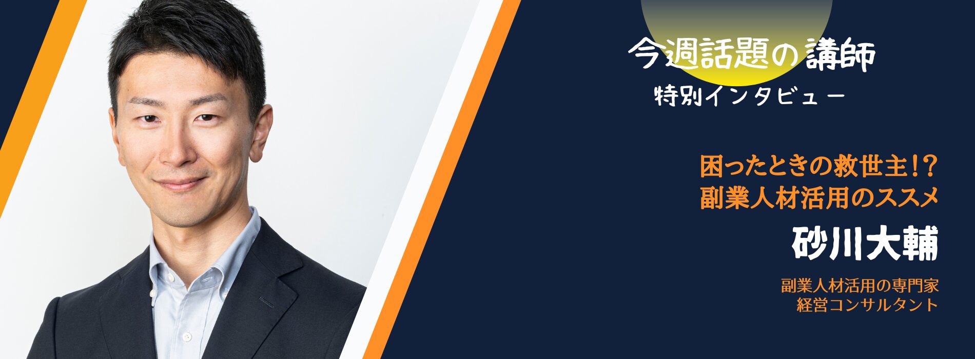 今回は、大企業の会社員でありながら、副業プロ人材として200社以上の企業を支援し、自ら経営者としても活躍する”副業人材活用のプロ”砂川大輔(すながわ だいすけ)さんに、副業人材の導入前に知っておきたいポイント、副業市場の「今」について、お聞きしました。