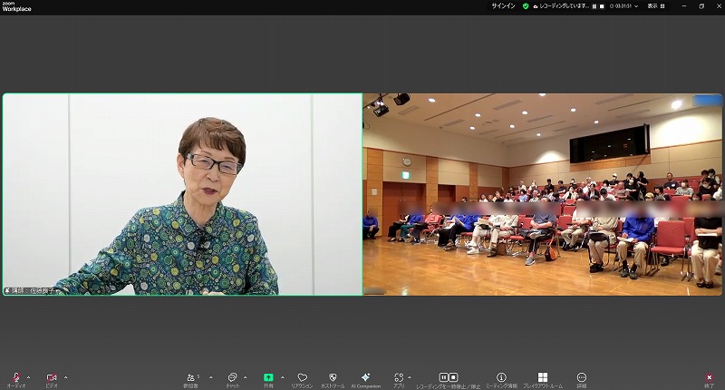 K市男女共同参画講演会に登壇したのは、東京都立川市の大山団地で長年自治会長を務めてきた佐藤良子さん。今回の講演は、弊社の東京スタジオからオンラインで中継され、それを市民がホールに集まって聴講する形式で開催されました。