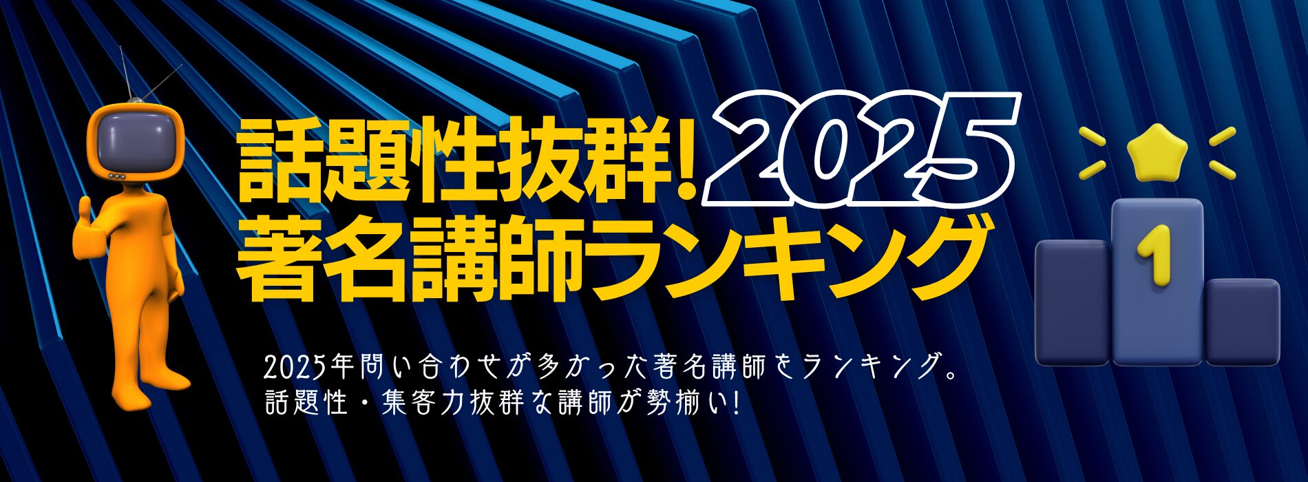 2024年8月~2025年7月の1年間で、問い合わせが多かった著名講師のみを厳選し、ランキング形式でご紹介します。いずれもテレビや新聞、雑誌などメディア露出が多く、知名度・発信力・集客力に優れた講師ばかり。経営者層を対象...